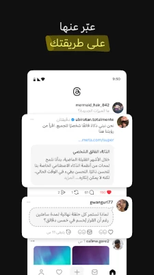 Threads هو تطبيق المحادثات النصية من Instagram، مكان يجمع المجتمعات لمناقشة أحدث المواضيع. تواصل مع المبدعين وتابع نفس حساباتك على Instagram، وشارك أفكارك وآرائك لتبني مجتمعك الخاص.